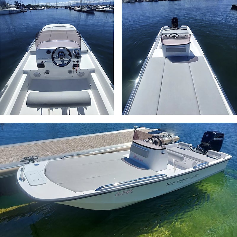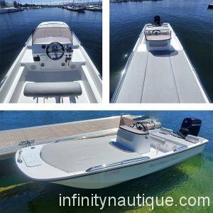 Moteur : 50cv Mercury 4T Avec sa remorque de route Matériaux construction : verre-polyester Longueur hors-tout : 5,05M Maitre bau : 1,95M Tirant d’eau : 30cm Poids lège : 450 kg Equipement = – sellerie complète bleu clair avec banquette AR et bain de soleil AV – Console – Bolster bi-places – GPSmap 723 Garmin – Pompe de cale électrique – Cockpit à l’avant de la console – Armement côtier 4 pers Coque aile de mouette, rapide et stable. Excellent comportement en mer même dans le clapot. C’est le bateau idéal pour des ballades en mer ou en rivière. Configuration en mode pèche possible très facilement (transformation cockpit AV en vivier, installation de différents accessoire…. en sus). Sous le pont, se trouve un grand coffre permettant d’y ranger les cousins et plus encore.