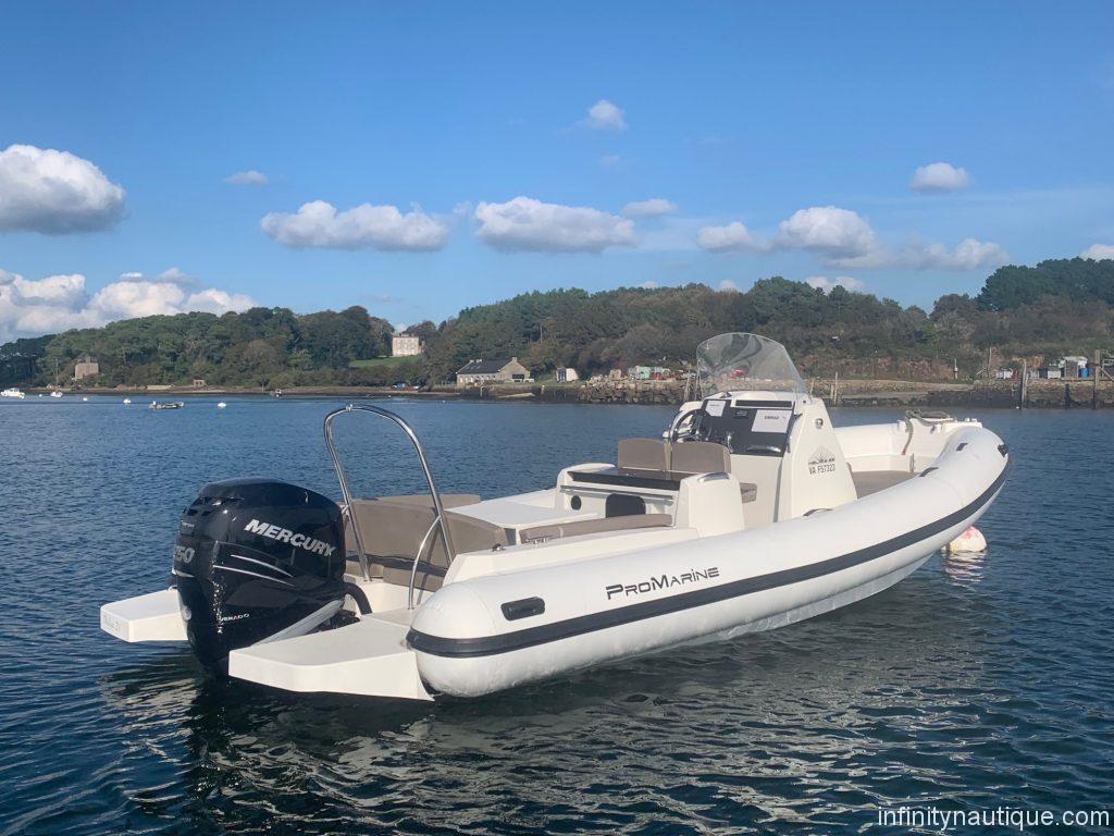 Semi-rigide Pro marine modèle Helios 25 de 2017 à la silhouette puissante dotée d’une ligne ascendante du flotteur lui donnant un caractère hauturier et sécurisant.