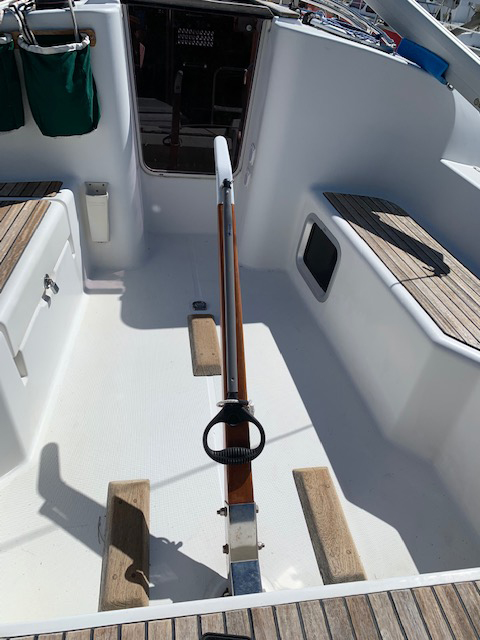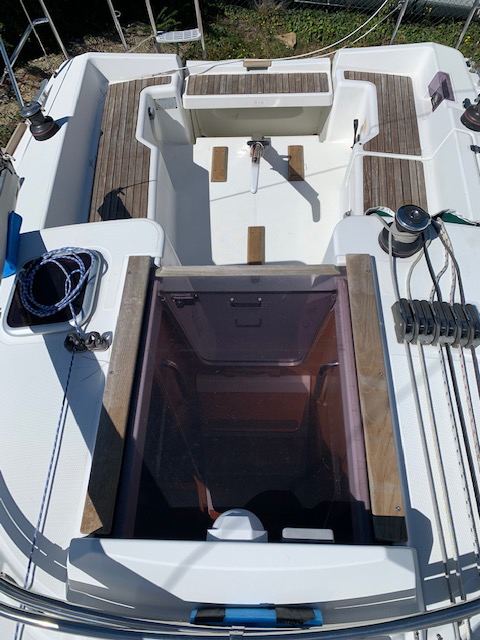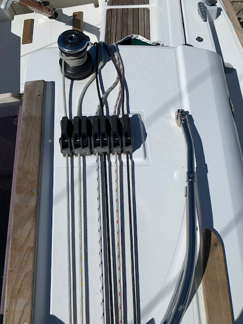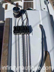2 winchs de génois Harken Self tailing1 winch de roof Harken Self tailingBloqueurs sur roofPalan de GV avec ancrage amovible dans le cockpitLattage bois massif sur banc de cockpitSac à drissesCoffre de cockpitCoffre pour radeau de survieBarre franche avec stickCompasCapote de roofHousse de barreGuindeau électrique