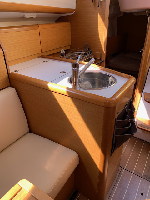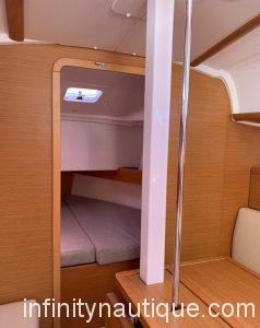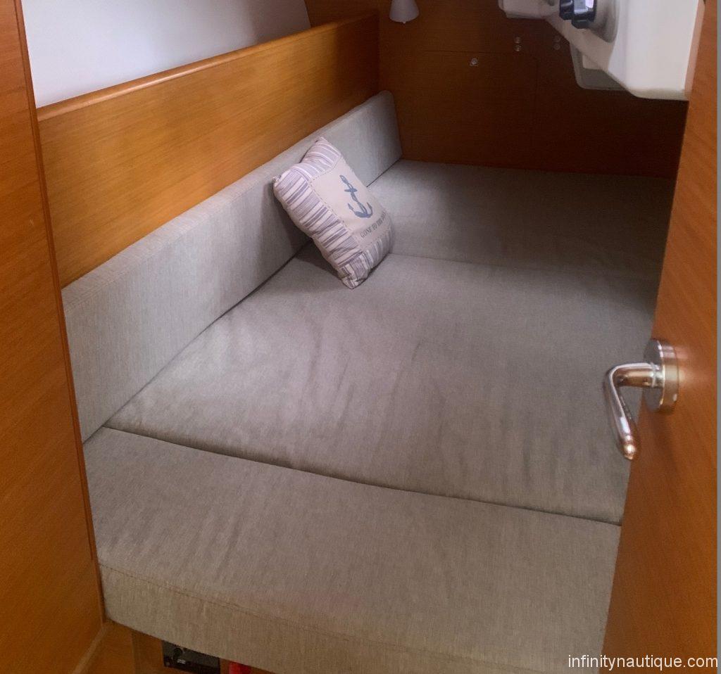 Couchette double cabine arrièreCouchette double cabine avantSalle d'eauCuisine réchaud Eno 2 feuxRéfrigérateurEvier avec mitigeur chaud froidCarré avec rangements sous assisesMultiples rangements + penderiesTable a cartes + tableau electriqueVaigrage de coque en capitonnage clairTable de carré rabattable