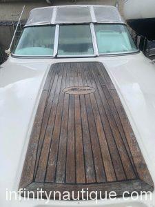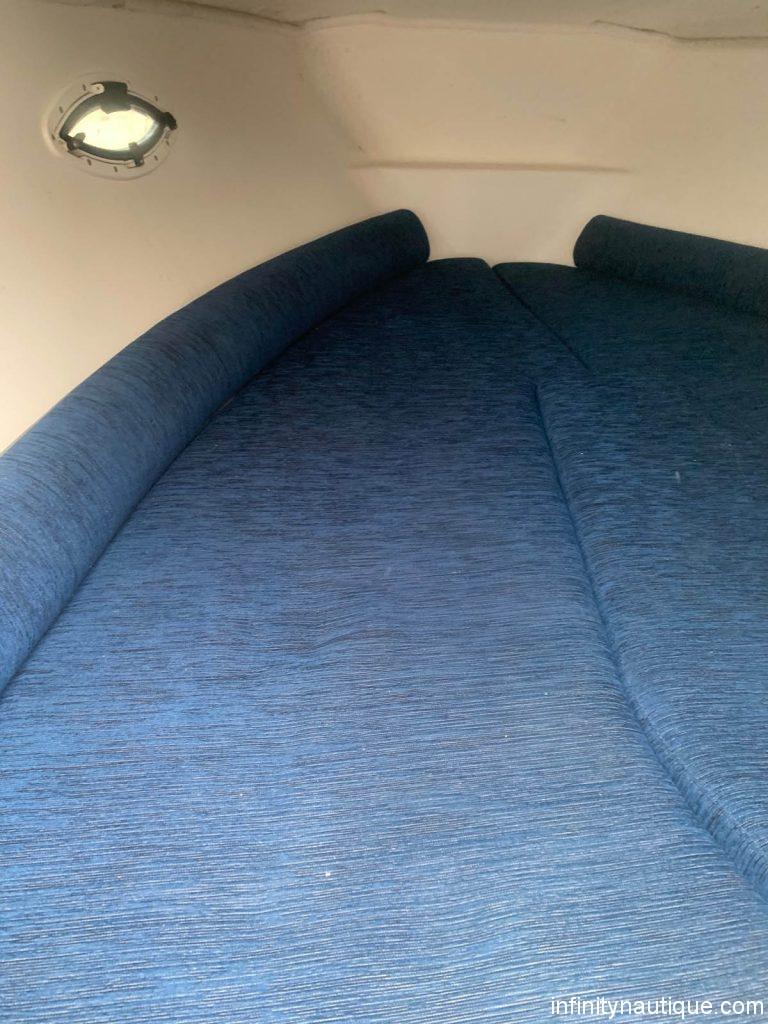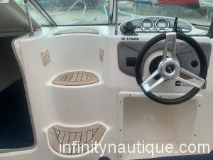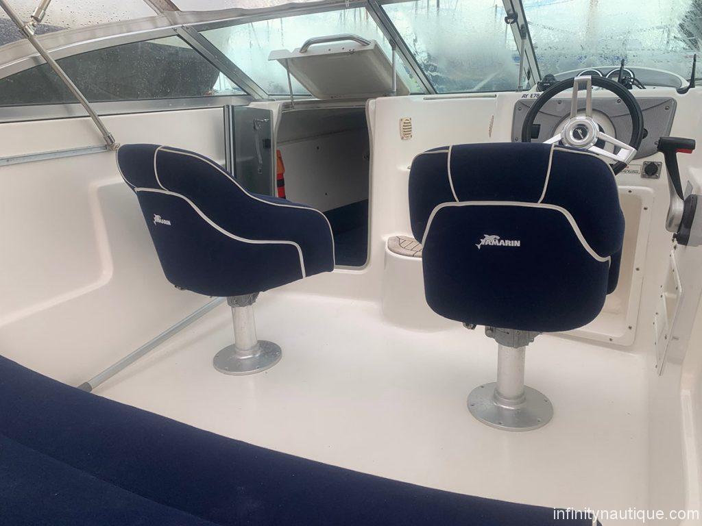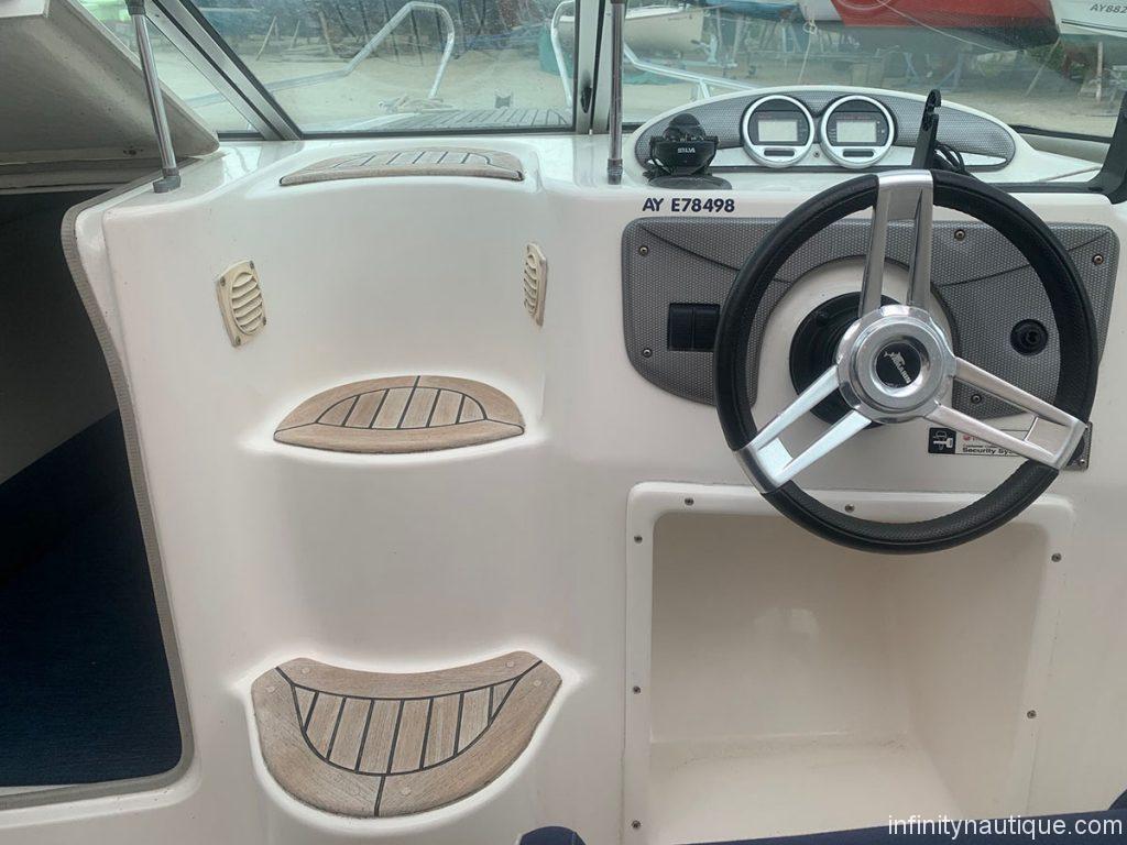 Pont avant et marche en teckPare brise panoramique avec passe avantSet de sellerie confort luxe2 sièges de pilote et co-pilotes en sunbrellaBanquette arrière en sunbrellaRéservoir carburant 90LFeux de navigationPrise de 12 VHublots ouvrantsÉquipements - Électronique de navigation