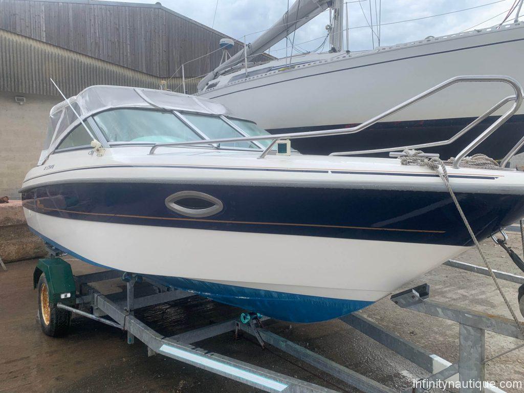 Matériau de constructionPolyesterLongueur hors tout5,73 mètresLargeur maxi2,20 mètresTirant d'eau-Poids lege720 kgType de lest-Capacité carburant90 L - EssenceCapacité eau160 LCouleur de coqueBlanc et bleuMotorisation
